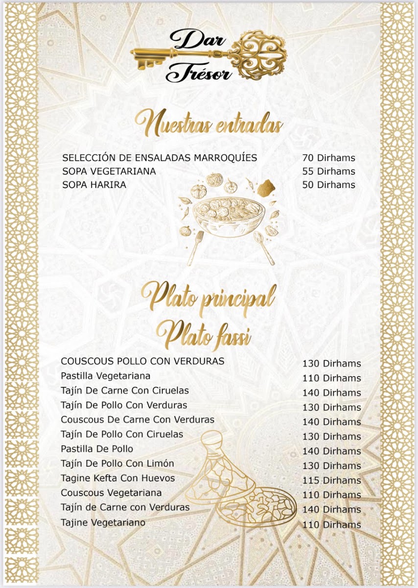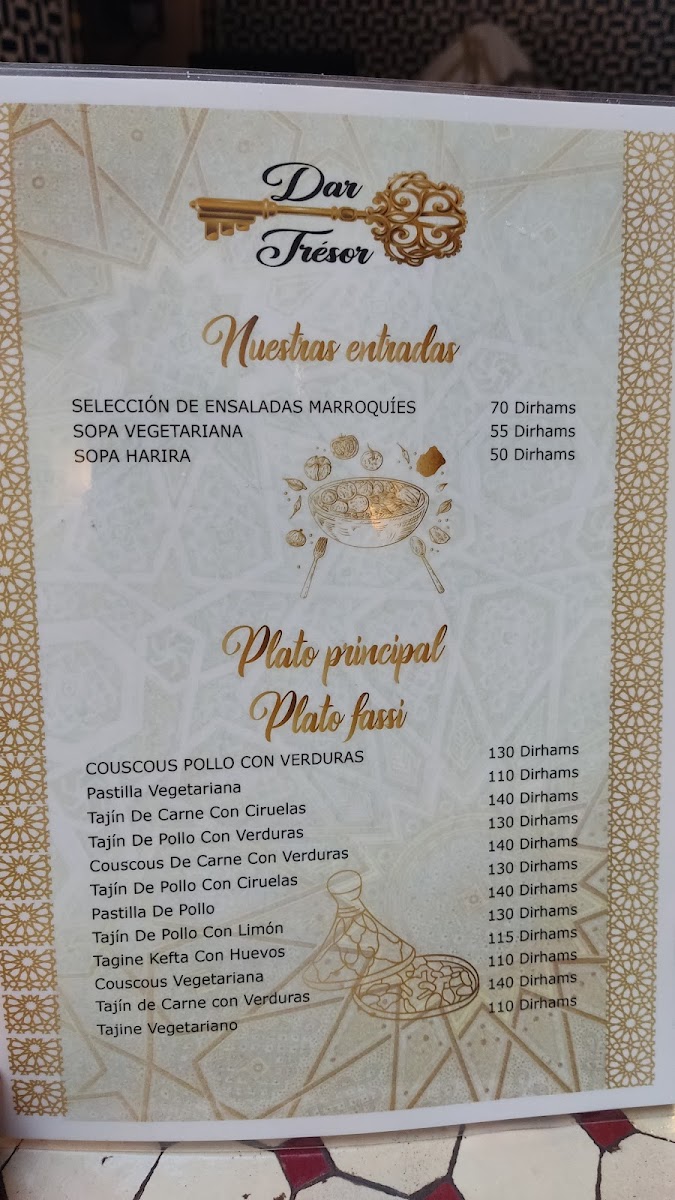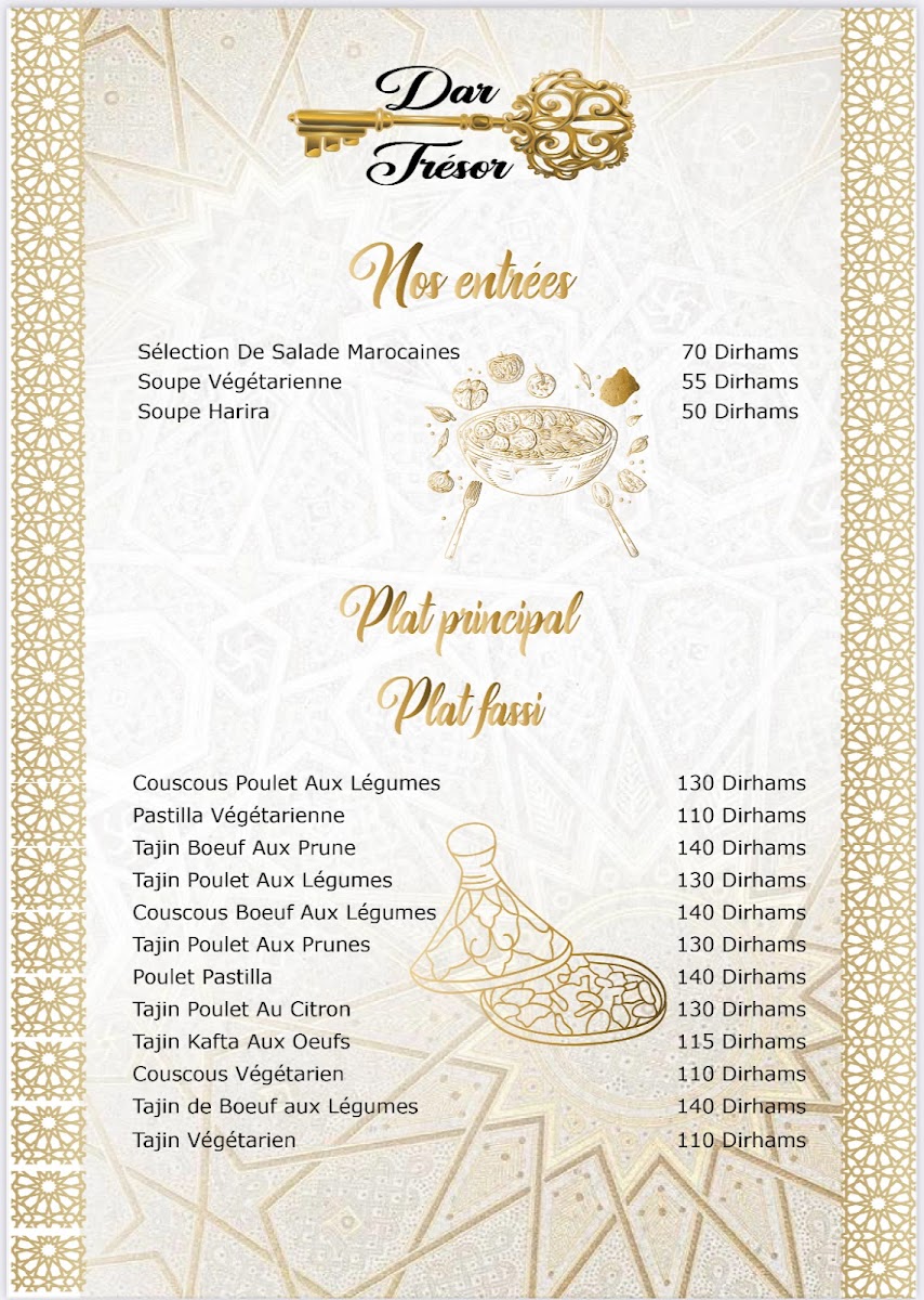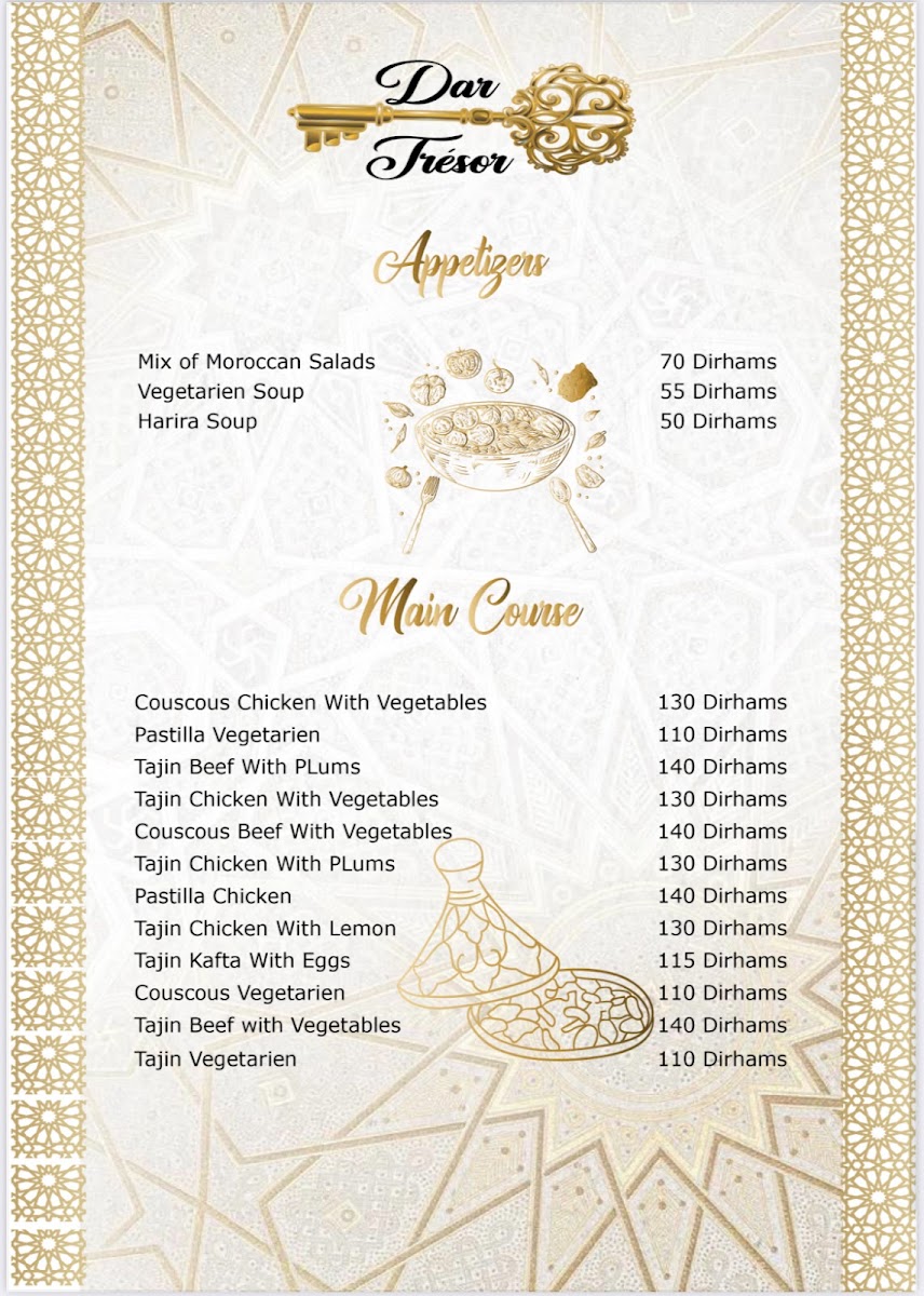 In conclusion, the menu at Restaurant Dar Tresor Fes offers a satisfying glimpse into traditional Moroccan cuisine, combining comforting flavors with thoughtful presentation. The Tajine Meat with Vegetables stands out as a hearty centerpiece, rich in slow-cooked spices and tender textures that reflect the kitchen’s authenticity. Starters like Harira Moroccan Soup or Moroccan Salad provide a balanced introduction, whether you prefer the warmth of a classic soup or the freshness of local ingredients. To round off the experience, the Tè Caldo Verde delivers a soothing and aromatic finish, enhancing the overall meal with a touch of simplicity. Altogether, the menu feels cohesive and well-curated, making it a rewarding dining experience for anyone seeking genuine Moroccan flavors.