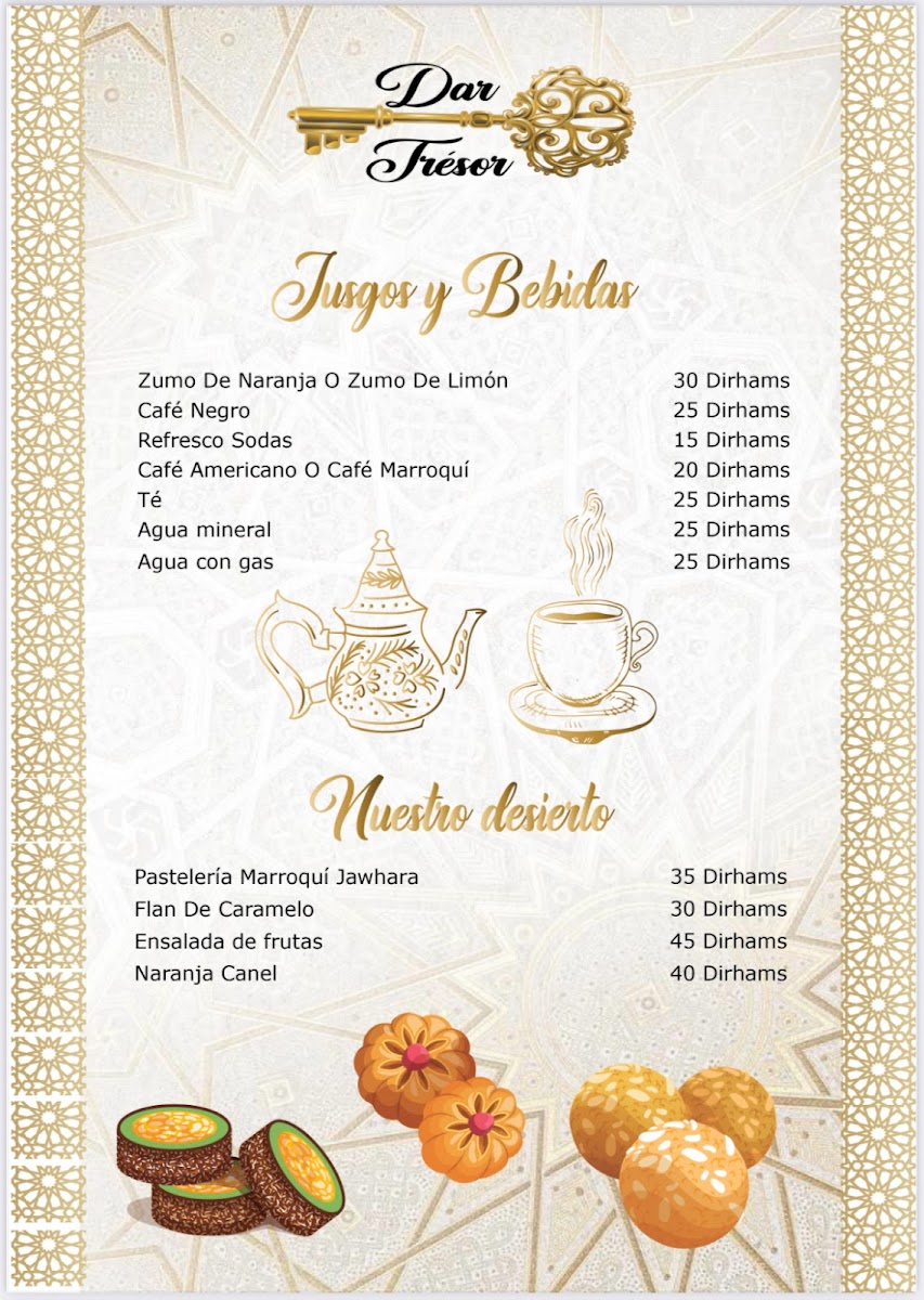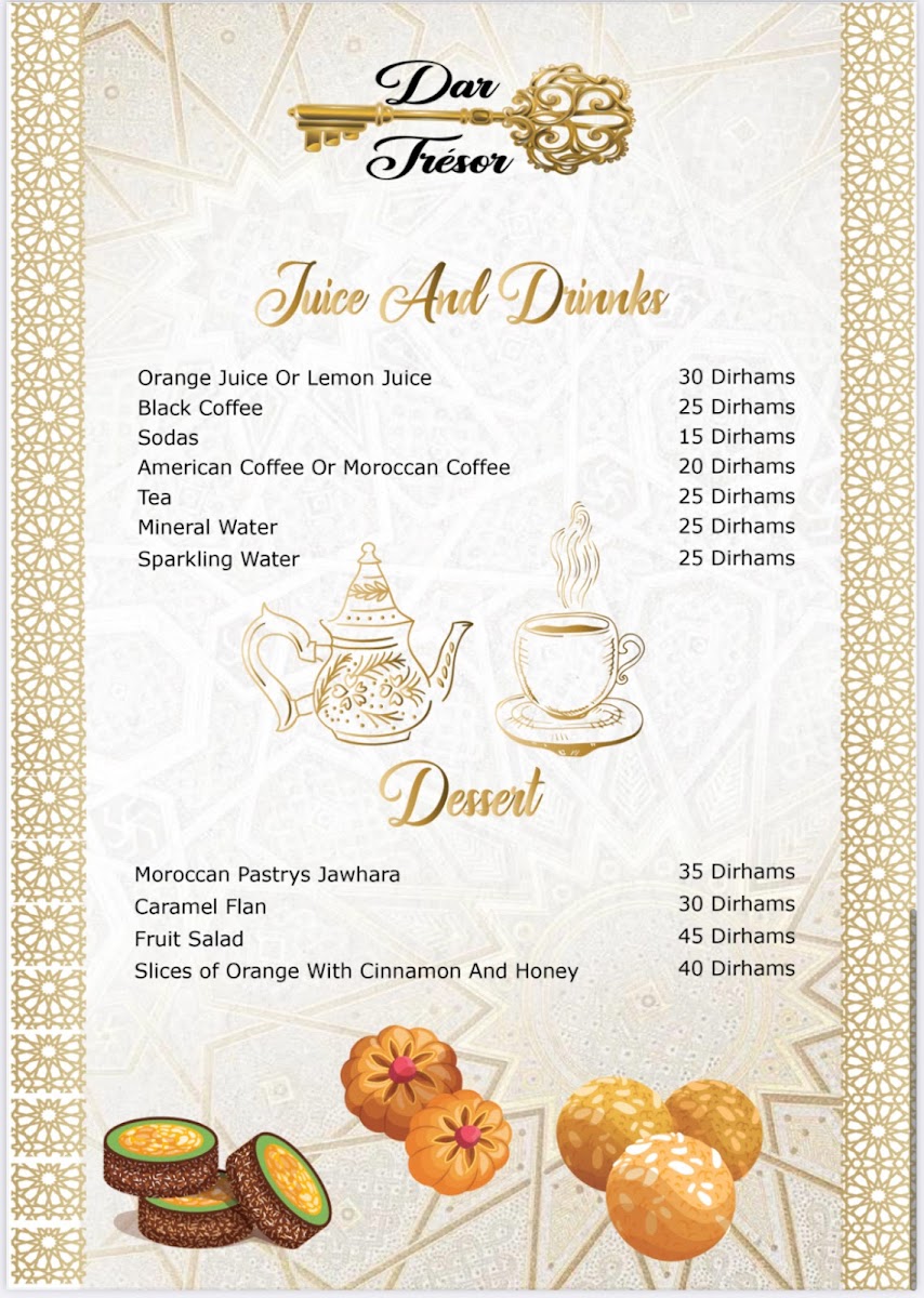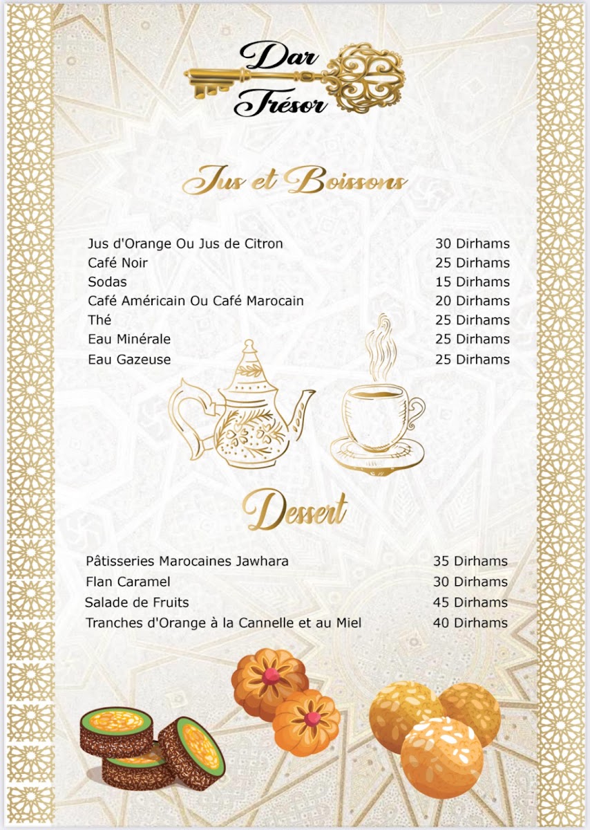 In conclusion, the menu at Restaurant Dar Tresor Fes offers a satisfying glimpse into traditional Moroccan cuisine, combining comforting flavors with thoughtful presentation. The Tajine Meat with Vegetables stands out as a hearty centerpiece, rich in slow-cooked spices and tender textures that reflect the kitchen’s authenticity. Starters like Harira Moroccan Soup or Moroccan Salad provide a balanced introduction, whether you prefer the warmth of a classic soup or the freshness of local ingredients. To round off the experience, the Tè Caldo Verde delivers a soothing and aromatic finish, enhancing the overall meal with a touch of simplicity. Altogether, the menu feels cohesive and well-curated, making it a rewarding dining experience for anyone seeking genuine Moroccan flavors.